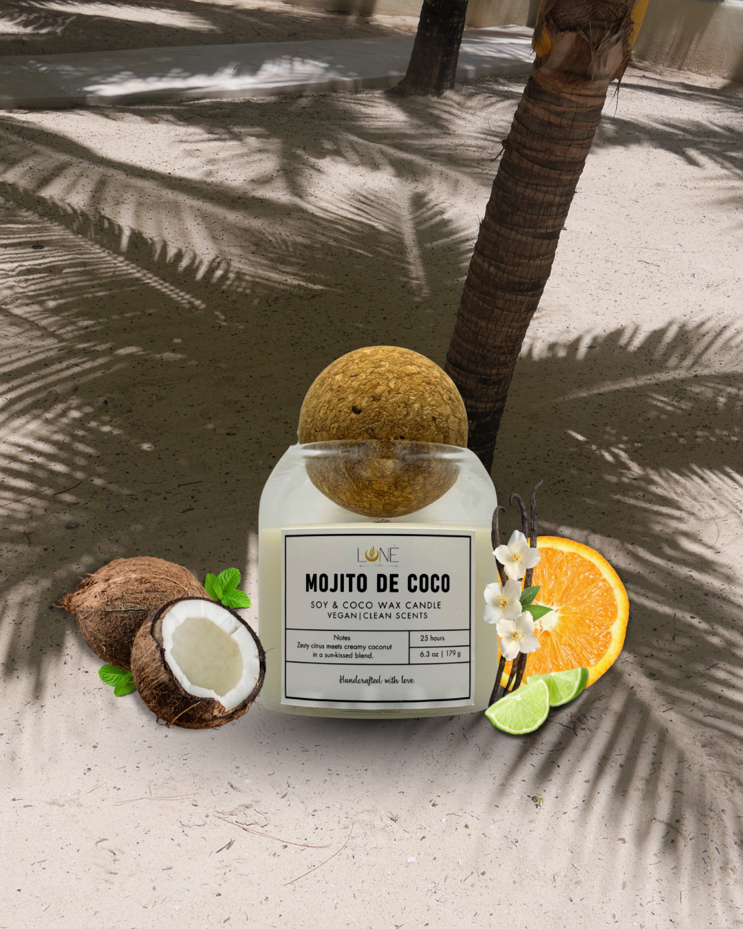 Mojito de Coco is a 11oz handmade vegan candle crafted from eco-friendly soy and coco wax, featuring an eco wick for a clean, sustainable burn. This sophisticated scent blends zesty citrus with creamy coconut, evoking a sun-kissed ambiance that brightens any room with a refreshing and elegant touch.
