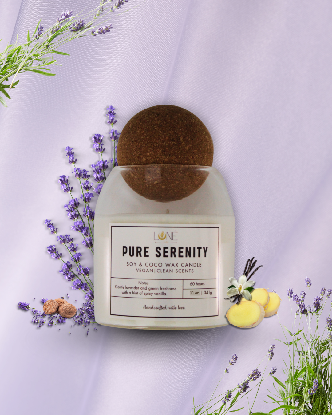 Pure Serenity is a 11oz handmade vegan candle crafted from eco-friendly soy and coco wax with a clean-burning eco wick. Its daring blend combines soothing lavender and vibrant green freshness, ignited by a bold hint of spicy vanilla, creating an unforgettable and provocative ambiance.