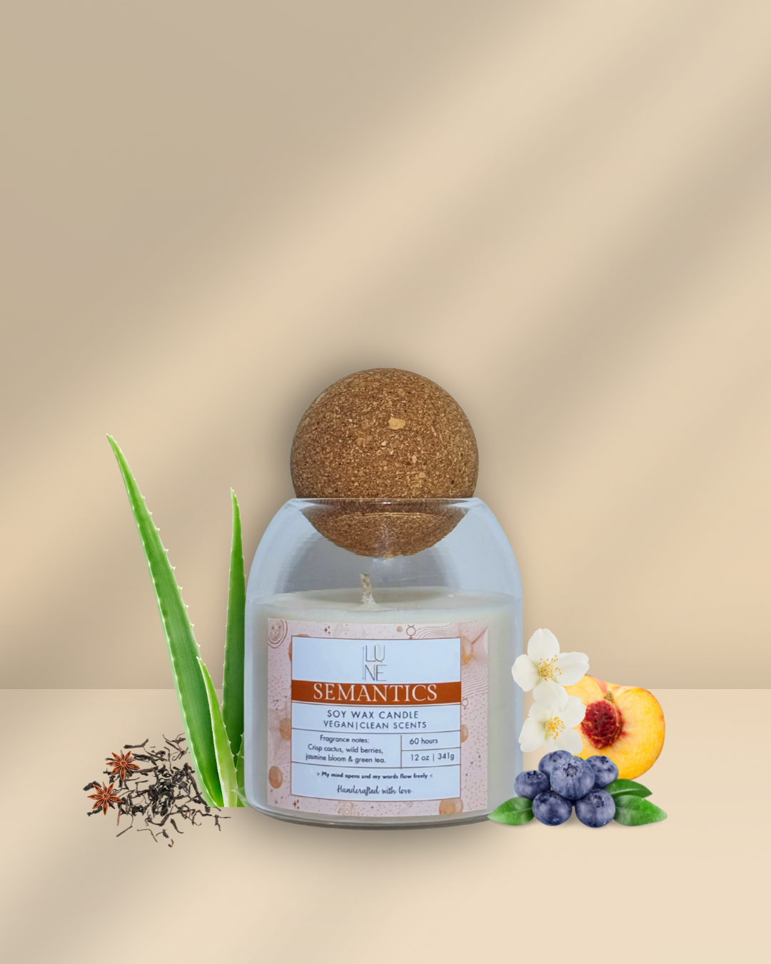 Semantics is a 11oz handmade vegan candle crafted from eco-friendly soy and coco wax, featuring an eco wick for a clean, even burn. Its sophisticated scent profile combines crisp cactus, wild berries, jasmine bloom, and green tea, offering a fresh and elegant aroma that elevates any space with subtle complexity and refined charm.